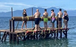 Al llegar, poco antes ya de hacer las pruebas en la playa de juegos de la isla Menor de Cayos Cochinos, es cuando nos desvelaron qué pruebas serían: El potro de vértigo y Desafiando a Diké. Por el nombre nos quedábamos igual, pero estando allí pudimos ver rápidamente las estructuras y que nos explicaran el mecanismo. Uy, igual no es tan fácil como parece, pero para eso dijimos que sí, para retarnos y probarlo. Total, nosotros no nos jugamos nada; no vamos a ser nominados y tenemos asegurada la comida después.