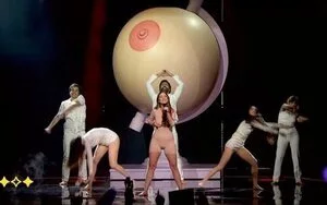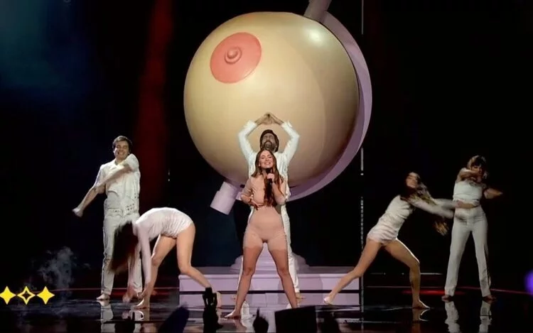 En un momento dado, Paula se va al centro del escenario y se tumba mientras el resto de personas que están sobre el escenario van junto a ella para quitarle el el vestido blanco que luce. Todo esto, acompañado de unos visuales en el suelo que, mientras la cámara graba en plano cenital, el equipo aprovecha para sacar al escenario la famosa y esperada teta gigante en un soporte de globo terráqueo. Esto podría significar que es algo mundial, que es algo que comparten todas personas de la Tierra.