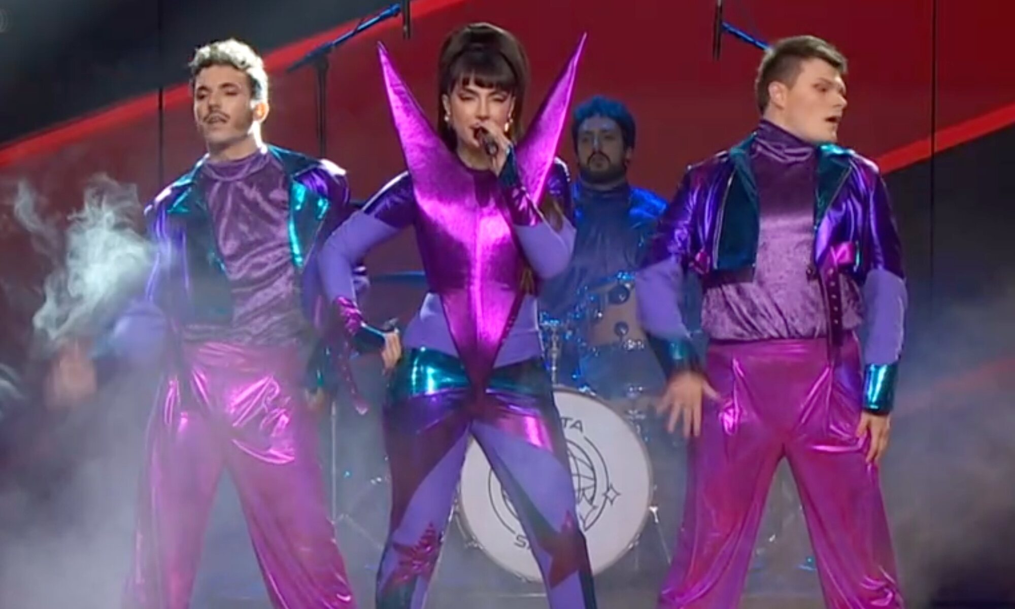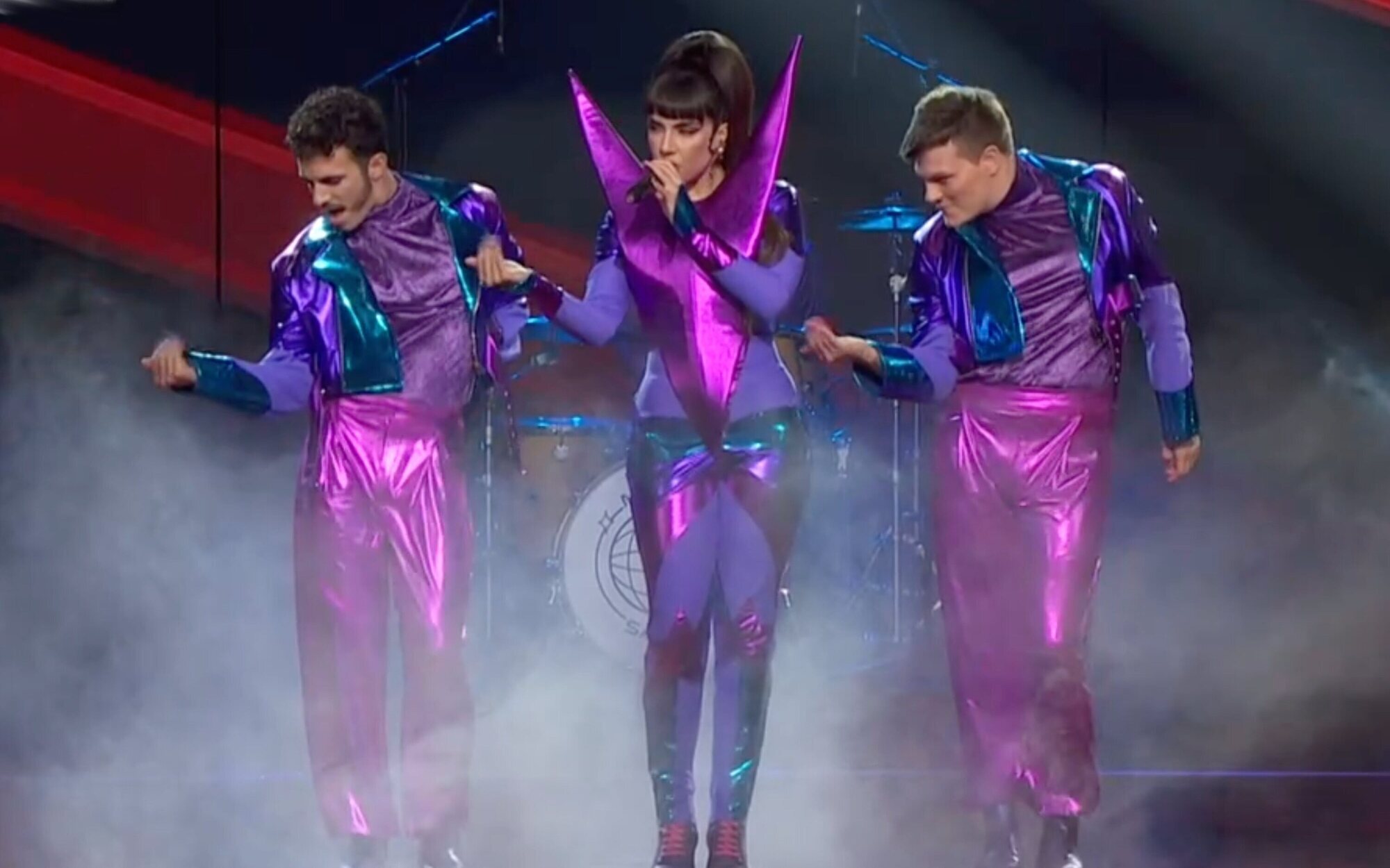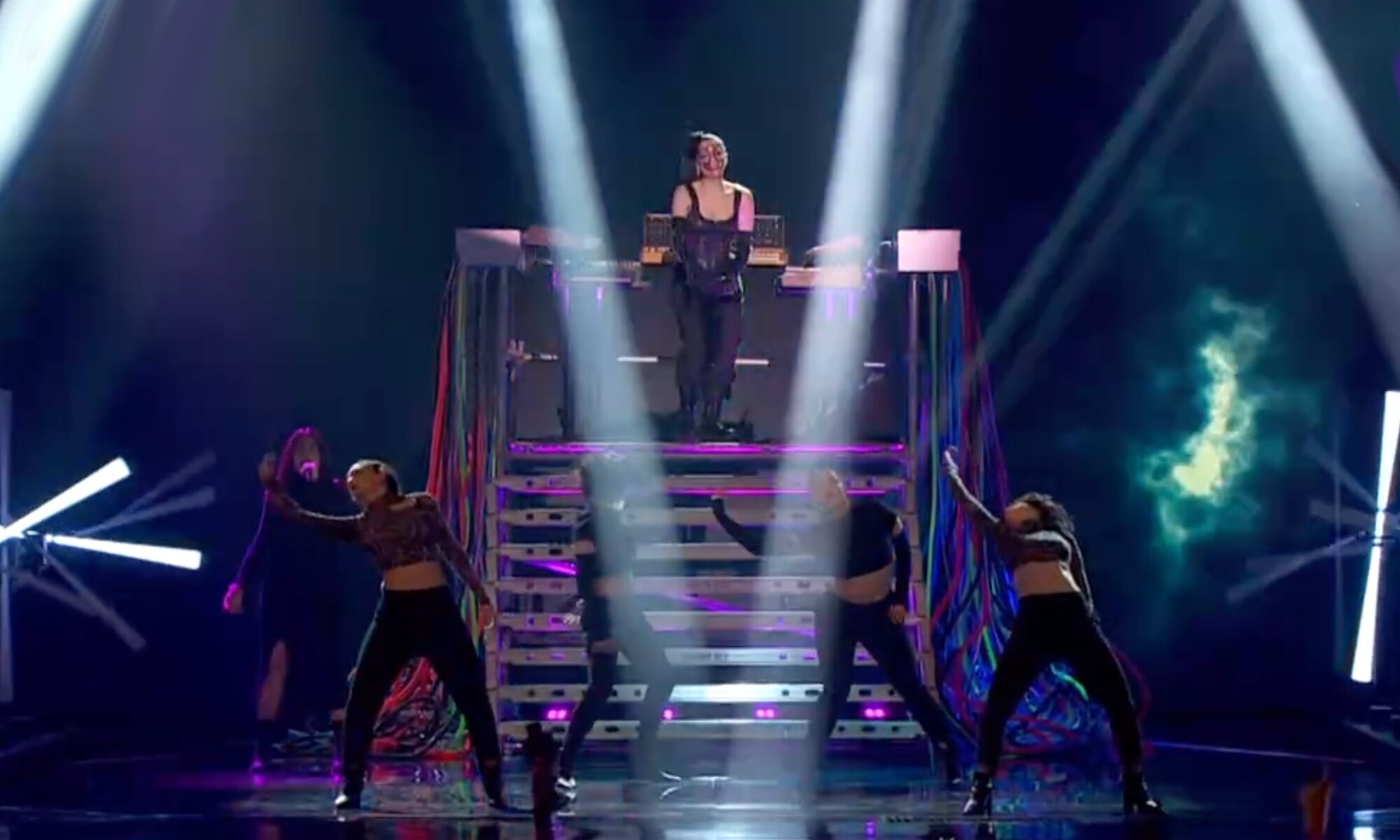 La artista chilena ha optado por la utilización de muchísimos elementos físicos para su puesta en escena. Una plataforma con dos teclados a los lados y una ristra de luces en el escenario han hecho de la actuación de Javiera Mena toda una declaración de intenciones. Su vestuario, caracterizado por sus dos coletas y una máscara de color plateado que recuerda al videoclip de "Culpa" encajan a la perfección con los visuales impresionantes de unas alas que entran en escena en la parte más instrumental.