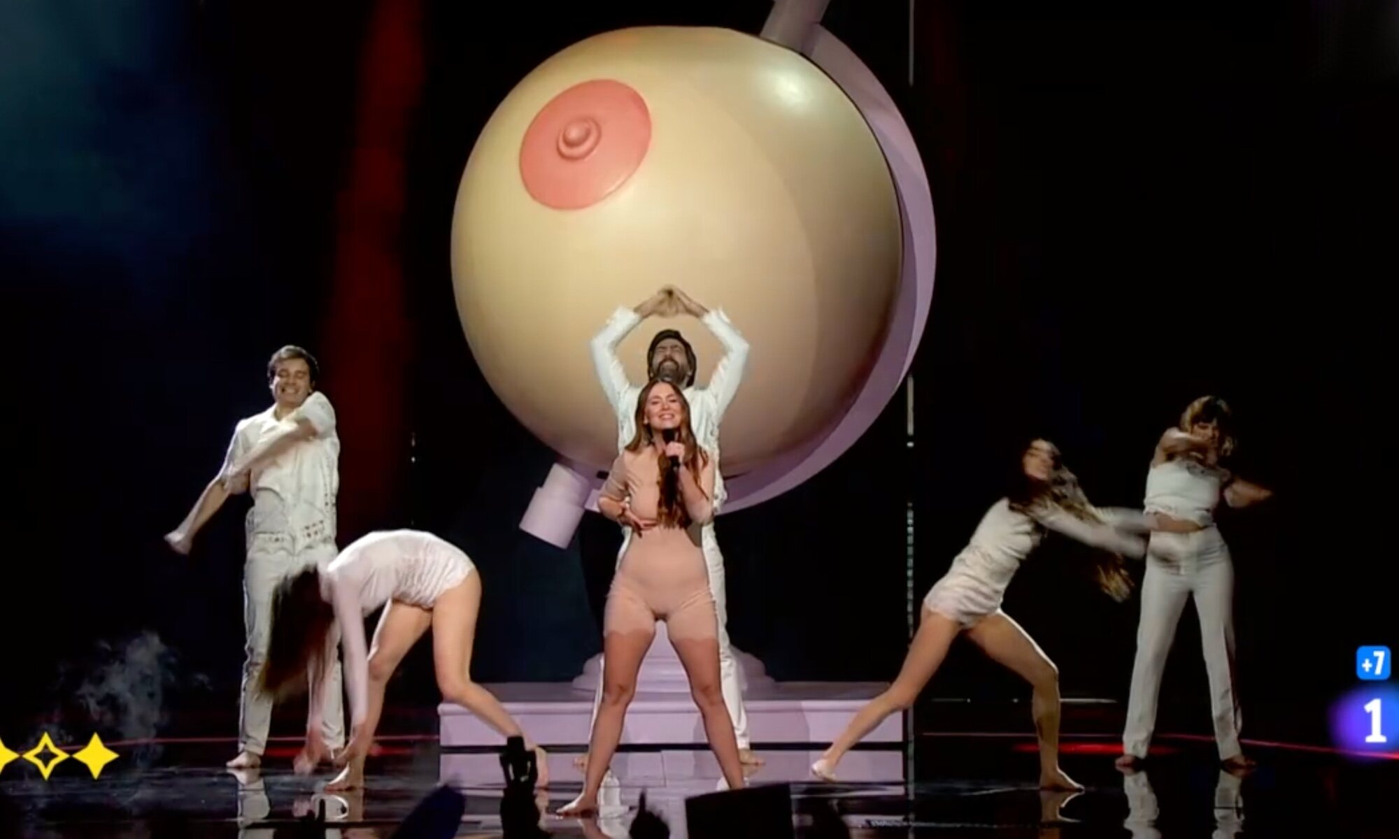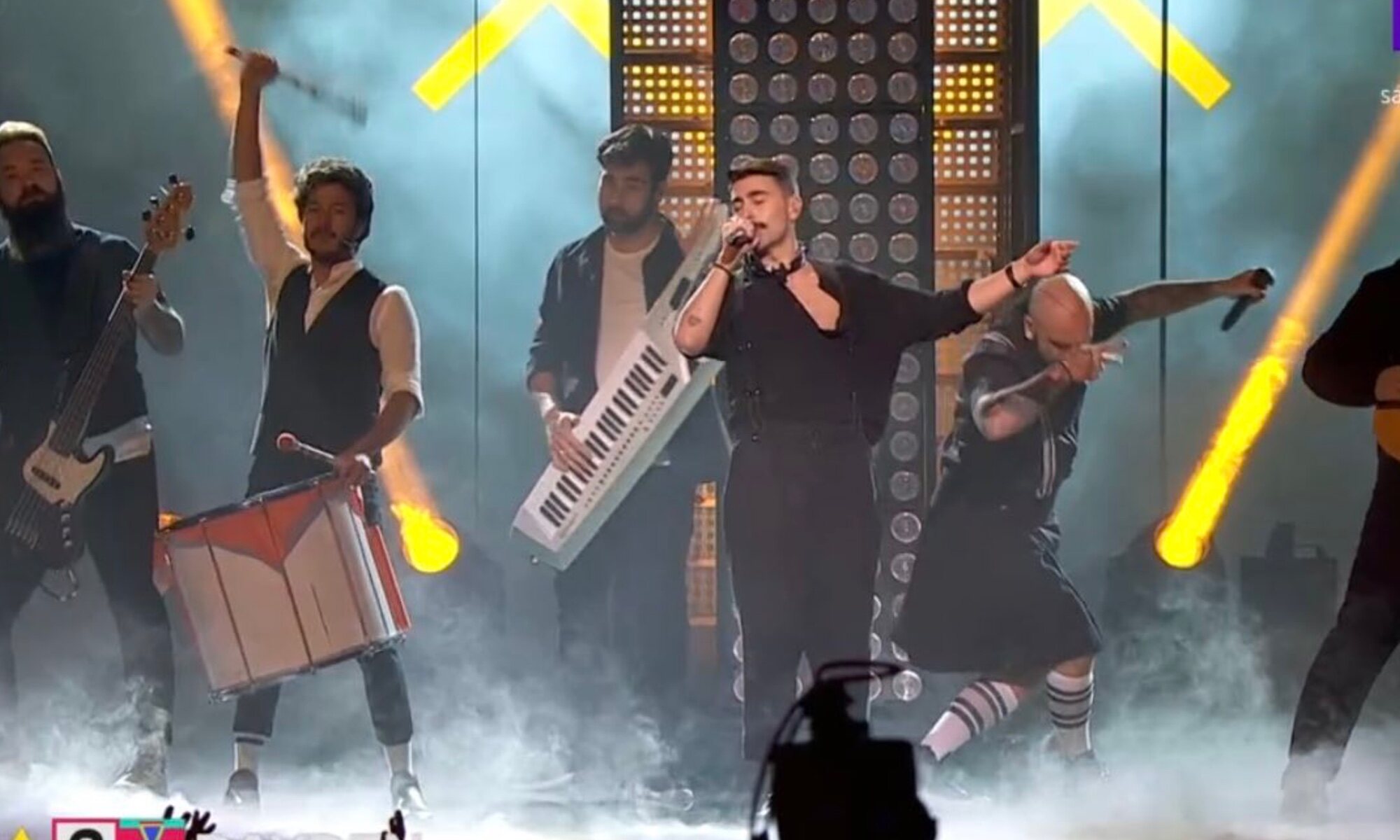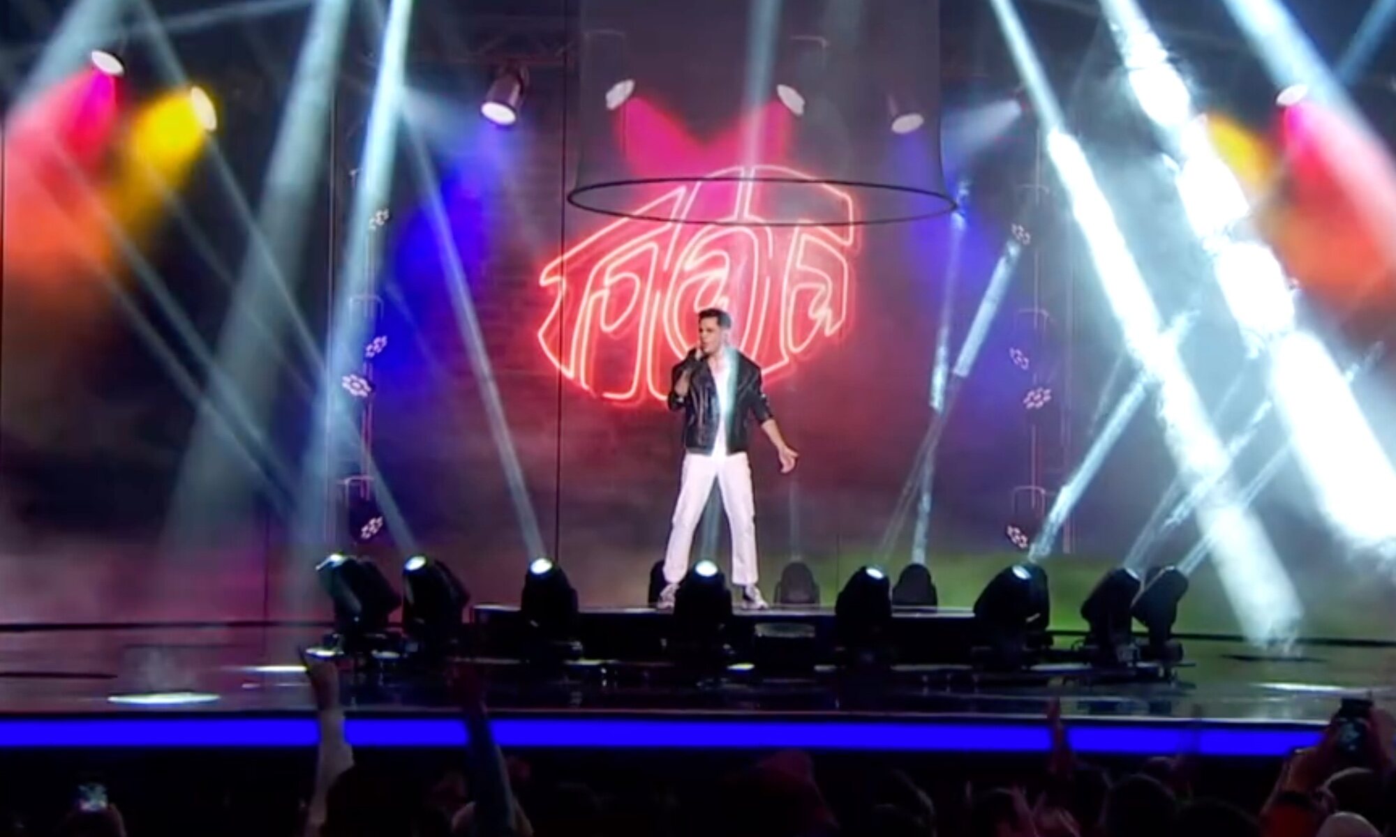 El rapero empieza su actuación subido en un púlpito gigante adornado con el logo que hemos podido ver en sus redes sociales, con el color naranja predominando durante casi toda la actuación. Tras jugar con la cámara, Rayden baja al escenario y, junto a sus cinco músicos, el cantante coquetea con la cámara, dando la espalda al público presencial del Palau d'Esports pero funcionando a la perfección en la realización. El fuego, la expresividad, la diversión y un juego de cámaras muy dinámico marcan la puesta en escena diseñada por Javier Pageo.