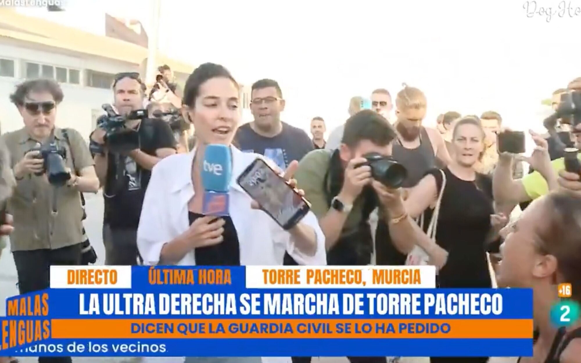 Esther Yáñez comenzó a hablar tras conectar en directo en 'Malas lenguas' para informar sobre cómo estaba siendo la concentración que se había acordado hacer en la plaza de Torre Pacheco. Tras comenzar a hablar, los asistentes empezaron a proferir insultos, y a gritos de "fuera, fuera" comenzaron a caldear el ambiente.