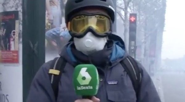 La situación ha pasado factura a los medios de comunicación, que han visto amenazada su tarea de informar con normalidad. Es por eso que David Puchol, corresponsal en París, ha aparecido en la conexión en directo con 'laSexta noticias fin de semana' completamente protegido de pies a cabeza, equipado con unas gafas especiales y una mascarilla para cubrir las vías respiratorias. "Me acabo de poner las gafas y la máscara porque acaban de tirar gases lacrimógenos y si no no podríamos seguir hablando", comunicaba el reportero a la presentadora Ana Cuesta.
