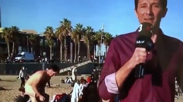 En el aire y con todo al aire. Así es cómo los espectadores de TV3 han podido ver a un bañista de la playa de Barcelona, que se desnudaba en la mismísima pantalla de sus televisores mientras el meteorólogo Dani Ramírez realizaba una conexión en directo con la cadena pública autonómica.