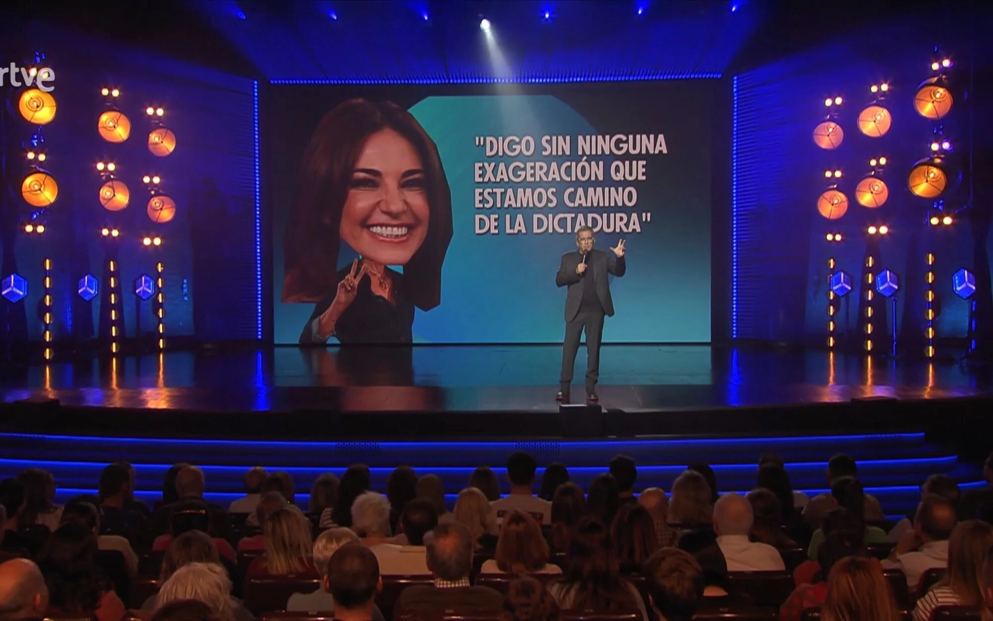 A continuación, destacaba un titular de Mariló Montero, a quien tildaba de "referente intelectual": "Digo sin ninguna exageración que estamos camino de la dictadura". Tras leer esta declaración, el presentador recordaba que le llamó su madre, preocupada preguntando si estábamos en otra dictadura. "Como ella ya vivió una verdad, le digo: No sé, mamá, igual la gente está confundiendo dictadura con que algo no les guste", poniendo como ejemplo a uno que pregunta qué hay de cenar, le responden que lentejas y contesta: "Esto es una dictadura".