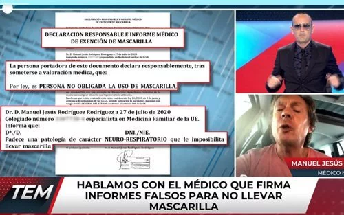 Momento tenso en 'Todo es mentira'. Un médico negacionista ha colgado en Internet un informe, firmado con su nombre, para que cualquier persona lo pueda imprimir, escribir su nombre y estar así exento de llevar mascarilla si la policía le pide el documento. Sin lugar a dudas, se trataría de un informe falso, pues el médico no está acreditando a qué pacientes se lo entrega, pues para él, nadie debería llevarla por el bien de su salud.