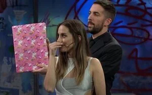 Llego el momento de entregar el regalo que trajo la invitada. "Esto es gravísimo, esto no se puede enseñar. Una cosa es que normalicemos las movidas, pero otra son cosas privadas. Estás loca", dijo Broncano al ver de qué se trataba. Silvia Alonso lo enseñó a cámara y explicó que era un cuadro basado en una foto de los dos que había pintado ella misma: "Me dijo que no lo ponía en casa porque no quería poner nada figurativo. Lleva un año en un cajón y he pensado que como aquí pones todo lo figurativo que te trae todo el mundo, lo podías poner aquí".