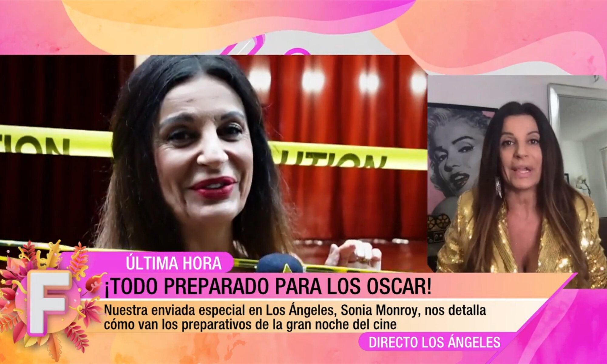 El programa de Telecinco, antes de dar paso al reportaje, puso un vídeo que había enviado Monroy a altas horas de la noche mientras volvía a su alojamiento. "Bueno, bueno, bueno, Emma. La que se ha liado haciendo el reportaje de los Oscar. He perdido un zapato, un pendiente, tengo el vestido roto de todo lo que he tenido que correr. Se ha armando una... ¡ay, Dios mío!".