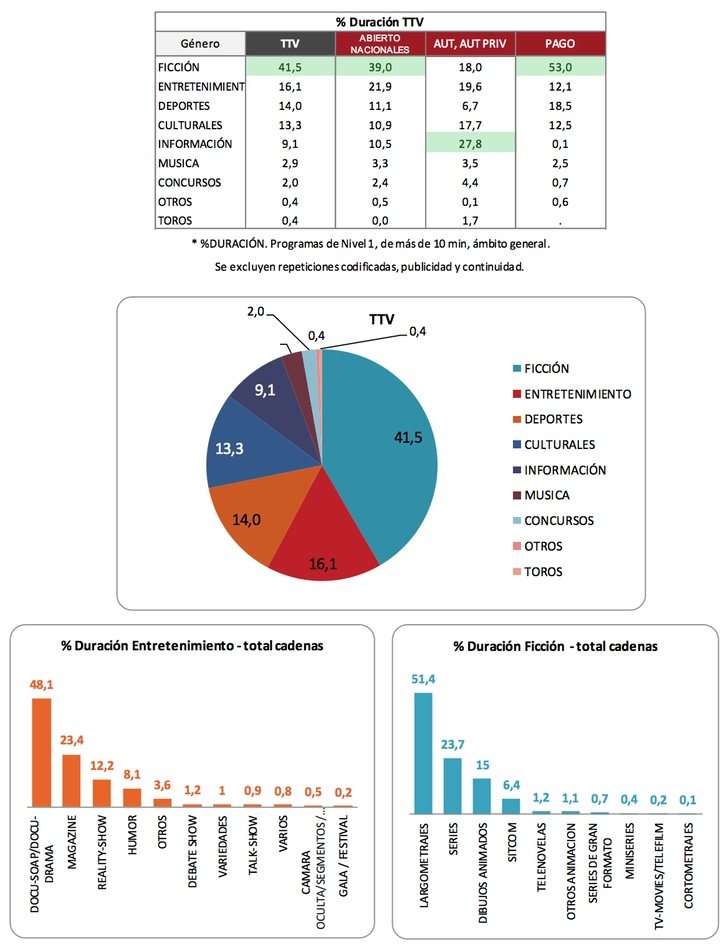 En el conjunto del total de cadenas, el género con mayor presencia en las parrillas de programación es la ficción, seguida del entretenimiento y los deportes. En el desglose por los tres grandes grupos de cadenas se muestra que tanto en las nacionales en abierto y las de Pago, el género de mayor presencia es la ficción; mientras que en las Autonómicas es la información. Dentro del entretenimiento, la especialidad que ocupa una mayor presencia dentro de las parrillas de la televisión son el docu-drama y los magazines.