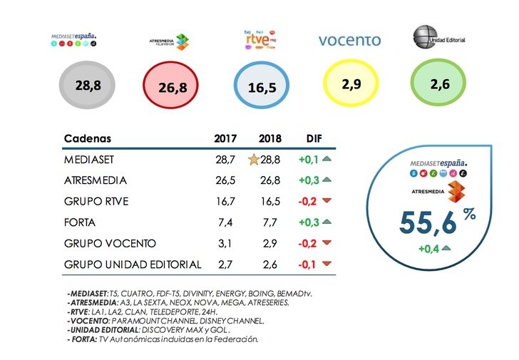 El liderazgo por grupos empresariales ha correspondido de nuevo a Mediaset España, que alcanza el 28,8% en el 2018, y que además muestra una subida de +0,1 puntos en relación al 2017. Atresmedia obtiene el 26,8% ( +0,3 puntos), Grupo TVE consigue el 16,5% (-0,2 puntos), Forta el 7,7% ( +0,3 puntos) Grupo Vocento el 2,9% (-0,2 puntos) y Unidad Editorial el 2,6 (-0,1 puntos). Los dos grupos de comunicación principales (Mediaset y Atresmedia) concentran el 55,6% del mercado de la audiencia, una mejora de +0,4 puntos en relación al 2017.