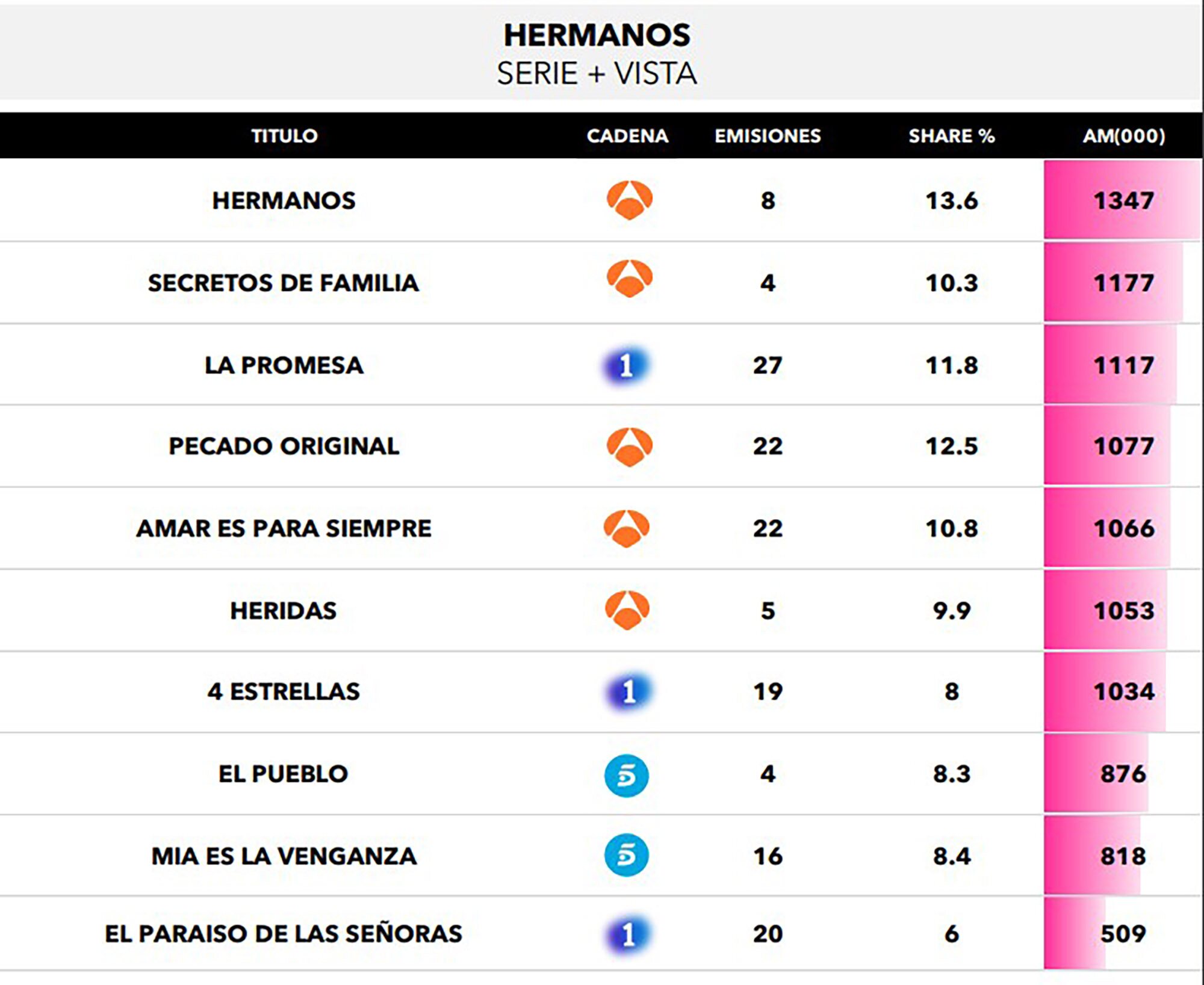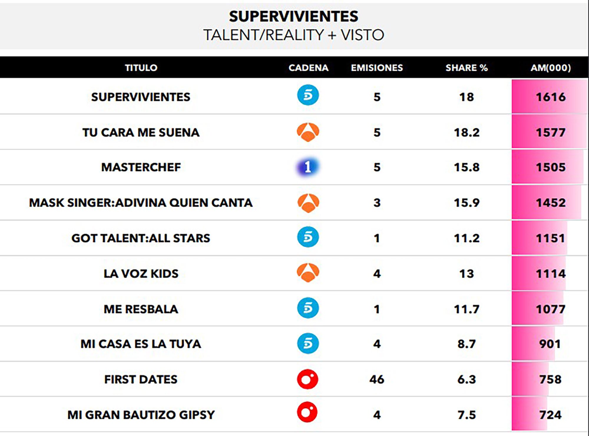 Un mes más, el mapa de España se tiñe de naranja. Antena 3 es la cadena líder en 12 de las 17 regiones españolas, destacando el liderato en Madrid con el 13,9% de share o en Andalucía con el 14%. Telecinco se hace con la primera posición en Euskadi (10,5%) y Canarias (14,4%), mientras que La 1 es la cadena más vista en La Rioja (15,9%) y Navarra (12,5%). Siguiendo la costumbre, TV3 mantiene el liderato en Cataluña con el 14,2% de share.