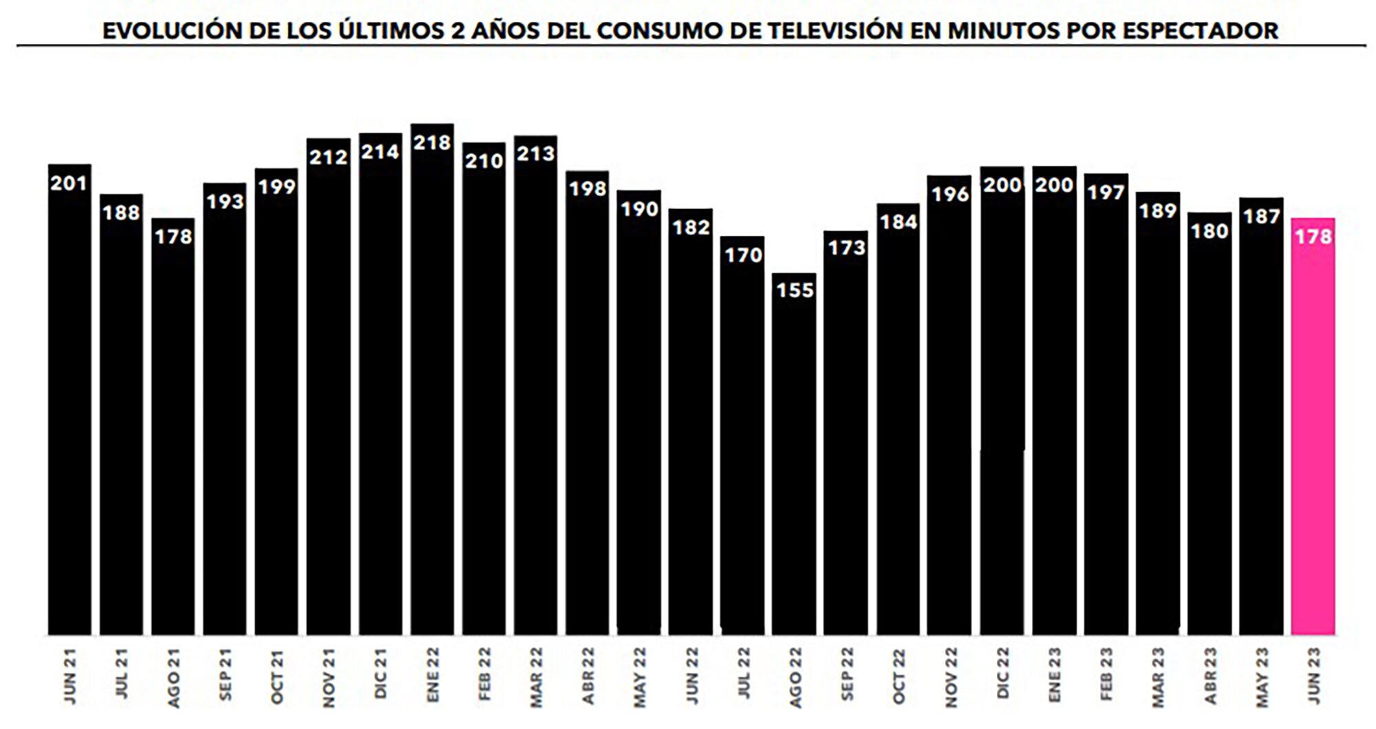 Tras la subida que se experimentó en mayo, el consumo de la televisión lineal vuelve a bajar en junio y marca una media de 178 minutos por espectador al día. Además, se pierden 23 minutos en comparación a junio de 2022. Sin embargo, se incrementa el consumo en mayores de 45 años y en usuarios que disponen de acceso a OTT.