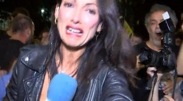 Cuando Pedro Piqueras dio paso a los periodistas de Barcelona, Laila Jiménez explicó cómo había vivido ese tenso momento unos instantes antes. "Las manifestaciones han sido pacíficas pero antes de empezar el directo han vaciado sobre nosotros una botella de licor", comentaba la trabajadora de Mediaset. Mientras estaba explicando lo ocurrido, una mujer que pasaba por al lado zarandeó su mano en frente de la cámara diciéndole "¡calla, pelota!".