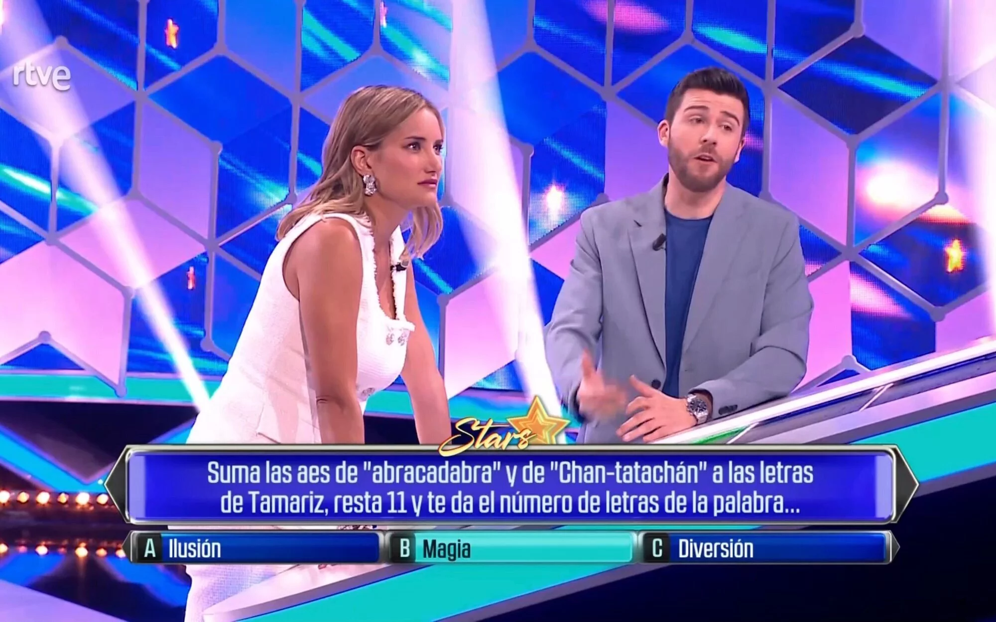 "Suma las aes de 'abracadabra' y de 'Chan-tatachán' a las letras de Tamariz, resta 11 y te da el número de letras de la palabra...". Con este enunciado, Alba Carrillo tenía que acertar en 'El cazador Stars' la respuesta correcta entre estas tres opciones: A) Ilusión; B) Magia; C) Diversión.