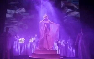 La cantante, bailarina y actriz interpretaba el tema con mucho entusiasmo, devorando el escenario y sirviendo un look muy atrevido, compuesto por una capa vaporosa de color rosa y un body de rejilla transparente que tenía piedras brillantes en dos sitios estratégicos: en los pezones y en sus partes más íntimas.