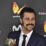 Hugo Silva sonriente con su galardón en la alfombra roja de los Premios Feroz 2017