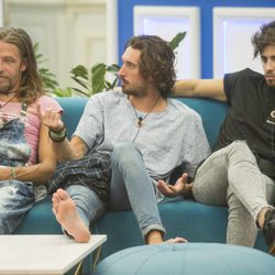 Maico, Christian G. y Rubén en la 7ª gala de 'GH Revolution'Maico, Christian Gabaldón y Rubé, sentados en el sofá de la casa de Guadalix de la Sierra durante la 7ª gala de 'GH Revolution'.