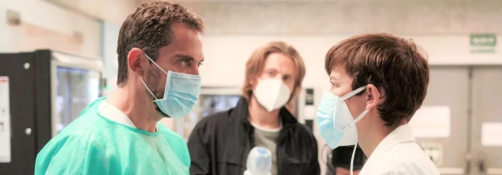 En ese contexto tan duro, la ficción trata de encontrar un rayo de esperanza, a pesar de mostrar la dramática situación, al adoptar un tono optimista y apostar por un género como la comedia romántica. El principal protagonista de 'Besos al aire' es Javi, un auxiliar de enfermería apasionado de las películas románticas.