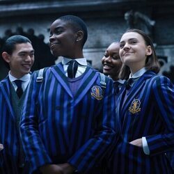 2x03 'La llamada de la tristeza' de 'Miércoles'Georgie Farmer, Jenna Ortega, Moosa Mostafa y Joy Sunday aparecen en una foto del capítulo 'La llamada de la tristeza' de la serie 'Wednesday'.