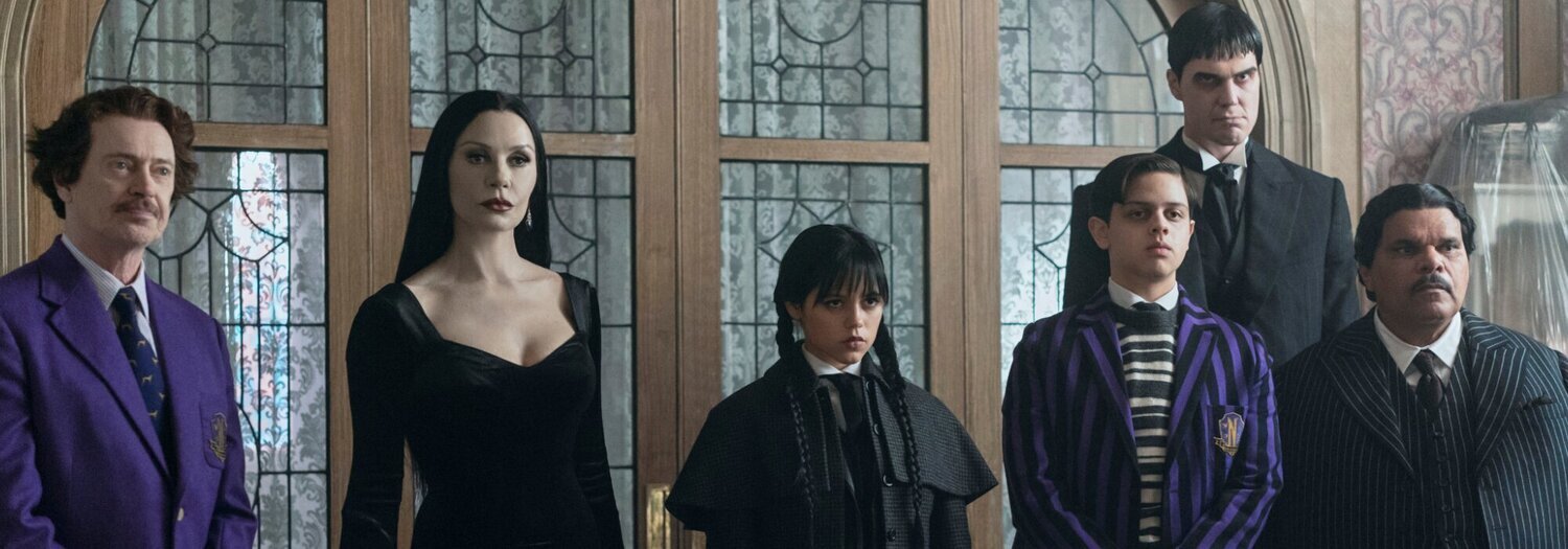 Imagen de Temporada 2 y el capítulo 01 de 'Miércoles'Catherine Zeta-Jones, Isaac Ordonez, Steve Buscemi, Jenna Ortega y Luis Guzmán aparecen en una escena promocional del capítulo 2x01 de 'Wednesday'.