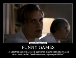 Ayer vi Valkiria; muy compleja, pero vale, bien (6/10), pero lo que más me impresionó fue Funny Games, Antena 3 00:30. Chavales, esta película es la polla. Salvo por un pequeño detalle que no me pareció ni oportuno ni necesario, me descoloco; brillante, magnífica. Una majestuosa clase de psicología y de manipulación que no olvidaré jamás... Y el título lleva razón, es un Juego divertido... Gran película. Y yo que me quería ir a dormir después de Valkiria Jajajajajajajajajajajajajaja! También creía que las películas de terror ya no me asustaban. Me mantuvo inquieto, nervioso, tenso desde el absoluto principio y hasta el final, esa macabridad, ese horror. Pegado a la pantalla! ¿Donde está el sueño? Ha desaparecido! O_o Es espantosa (en el mejor sentido, por supuestísimo). Lo que echaba de menos pasar miedo con una película!!!!!!!!!! Uau, la polla!!! Le doy un (9/10) y el 10 no solo por ese detalle que se escapa a cualquier explicación racional. Pero bueno, a lo mejor tiene que ser así y hay que entenderlo desde otro punto de vista...