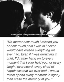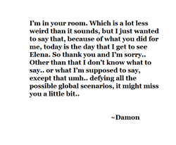 You’ve compelled enough people to know it’s just a way of covering the truth, and no matter how badly you want it done, it doesn’t make it any less of a lie, you know? Oh, I hear you breathing. You have no idea how long I’ve wanted to hear you breathe. Just open the door, Elena. Everything can go back to the way it was. Just open the door, Elena, please. (Damon to Elena, 6x06)