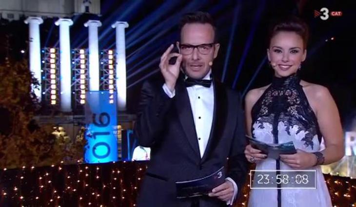 El profesor y jurado de 'Tu cara me suena', Àngel Llàcer, y la cantante Chenoa dieron la bienvenida al 2016 en la televisión catalana TV3 desde Barcelona.