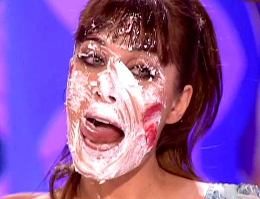 Cumpliendo su promesa, la reportera, ahora sustituta de Patricia Conde, recibió un tartazo en la cara.