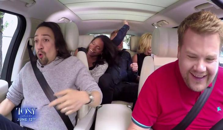 James Corden consigue juntar en un coche a Lin-Manuel Miranda, Audra McDonald, Jane Krakowski y Jesse Tyler Ferguson con motivo de los Premios Tony de Broadway y que canten canciones de musicales como Hamilton, Rent o incluso Los Miserables.