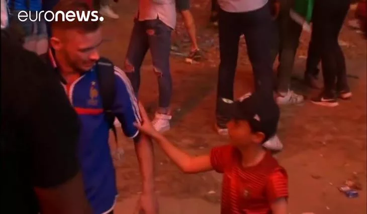 Emotivo gesto de un niño portugués a un aficionado francés que llora desconsoladamente