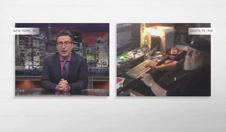 George RR Martin "muestra" a John Oliver una página de su libro Vientos de Invierno