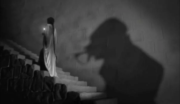 Una mujer sube unas escaleras, perseguida por una sombra en este video en blanco y negro que recuerda a las películas antiguas.