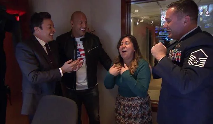 Jimmy Fallon y The Rock sorprenden en 'The Tonight Show' a una de las productoras del programa. Su nombre es Karina Kabalan y su marido, un veterano de los Air Force, vuelve a casa antes de lo esperado.
