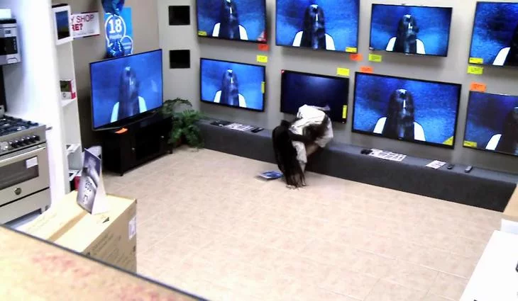 Los clientes presentes en el establecimiento no dudaron en mostrar su pánico al ver cómo la protagonista de la película salía de una de las televisiones.