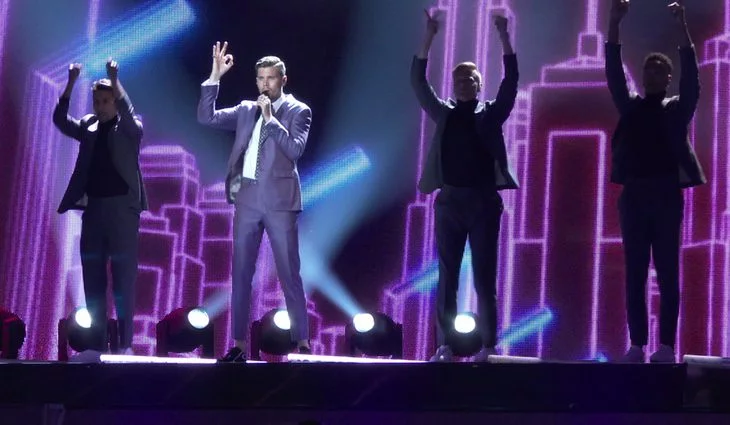 El representante de Suecia en el Festival de Eurovisión 2017 ensaya su canción "I Can't Go On" en el escenario del Centro Internacional de Exposiciones de Kiev (Ucrania).