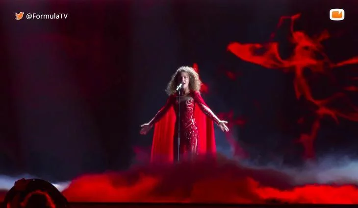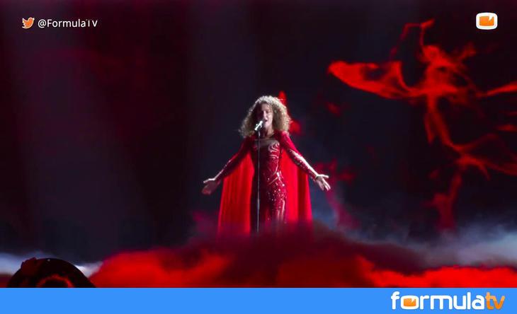 La representante de Georgia en el Festival de Eurovisión 2017 interpreta su canción "Keep the Faith" en el arena de Kiev (Ucrania) durante el primer ensayo de la primera semifinal.