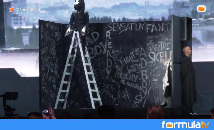 Dihaj (y la cabeza de caballo), representante de Azerbaiyán en el Festival de Eurovisión 2017 ensaya su canción "Skeletons" en el escenario del Centro Internacional de Exposiciones de Kiev (Ucrania).