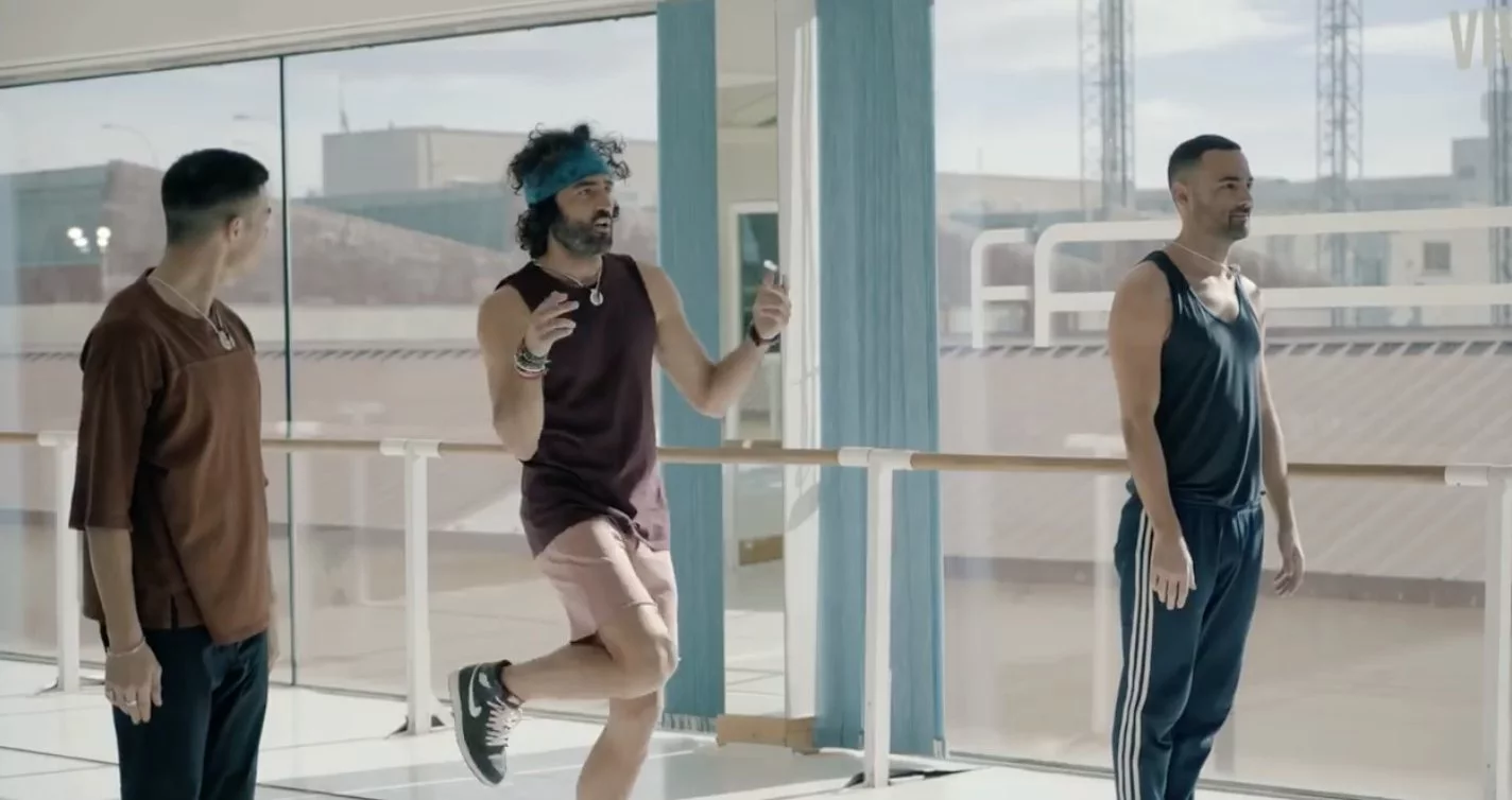 El presentador de 'El running show' intenta aprender la coreografía que han creado Iker Carrera y Raymond Naval.