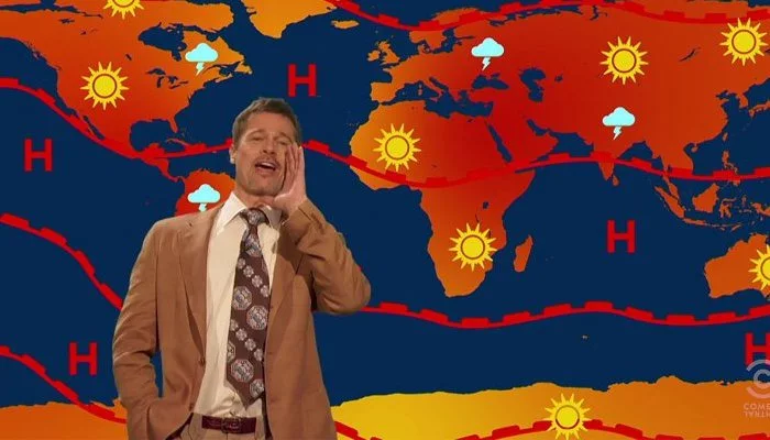 El meteorólogo del programa de Jim Jefferies, el actor Brad Pitt, ha vuelto a la carga con un importante y alocado parte meteorológico.
