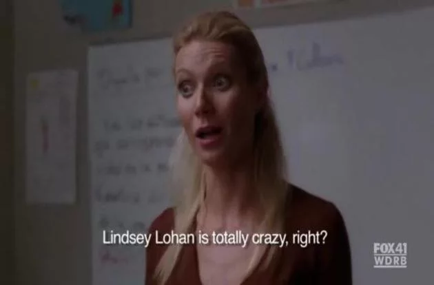 Momento en el que el personaje de Gwyneth Paltrow en 'Glee', la señorita Holliday, propone un debate sobre cuántas veces ha estado Lindsay Lohan en rehabilitación.