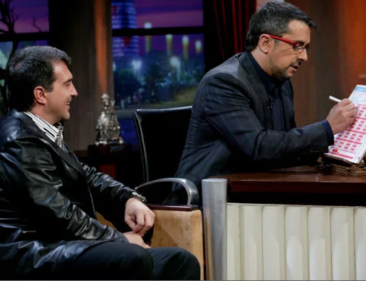 El presidente del F.C. Barcelona, Joan Laporta, rellena una quiniela a ciegas con Andreu Buenafuente en 'Buenafuente'.