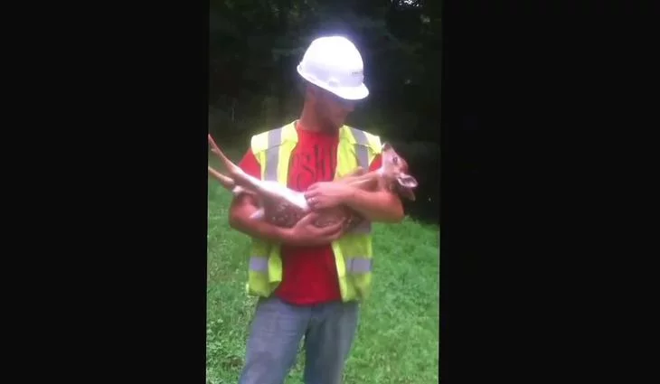 Adorable. Un pequeño bebé ciervo no quiere soltarse de los brazos de un hombre que le acaricia en la panza.
