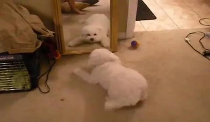 Perro que se sorprende de su reflejo en el espejo