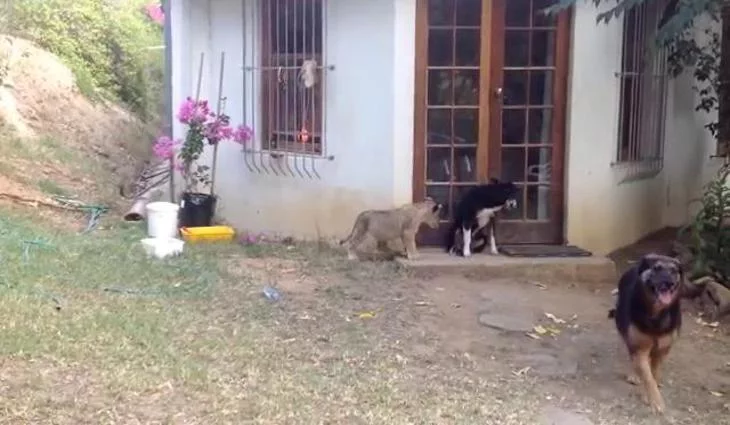 No sólo 'Los mayores gamberros' gastan bromas. El mundo animal está lleno de ejemplos de gamberros que acechan y asustan por pura diversión. Sin ir más lejos, estos perros se llevan un buen susto cuando una cría de león se acerca sigilosamente hasta ellos y se la encuentran cara a cara sin esperarla