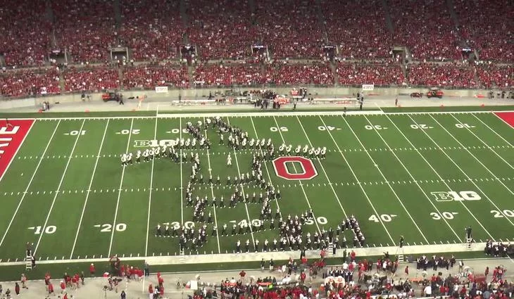 Las series de ayer y hoy a través de sus sintonías en una impresionante actuación de la banda de Ohio en el descanso de un partido, formando figuras humanas entre todos sus miembros.