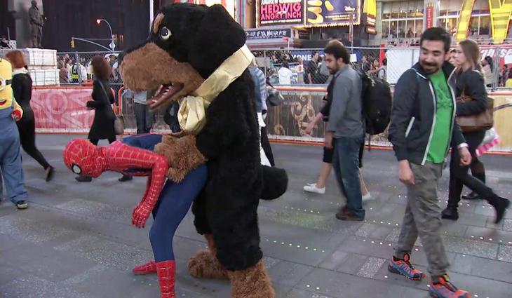 Triumph el perro cómico se desplaza hasta Times Square donde empieza a quedarse con todos los personajes asalta turistas... y acaba montándoselo con Spider-Man y metiéndole un puro a Minnie Mouse.