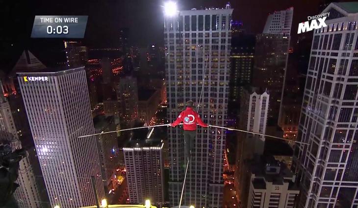Wallenda ha caminado desde la torre oeste del emblemático Marina City hasta el edificio Leo Burnett Building, y luego desde la torre oeste del Marina City hasta la torre este, algo que es la primera vez que se lleva a cabo.