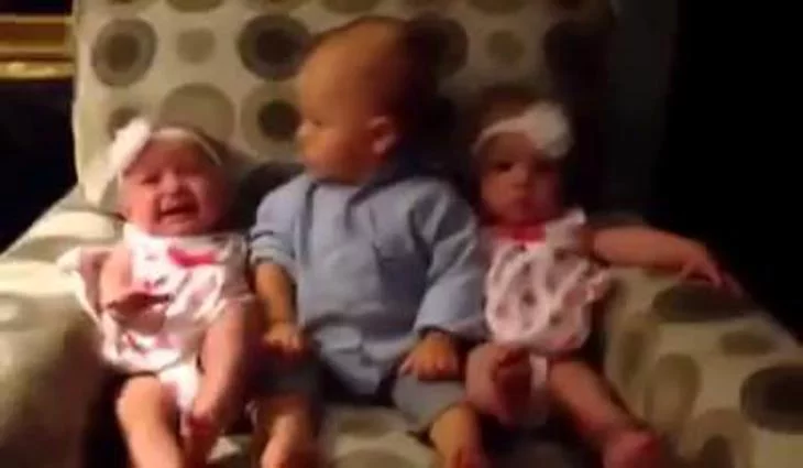 Sorprendido y perplejo se queda este bebé al ver a dos gemelas, y una de ellas llorar desconsoladamente mientras que la otra parece una muñeca de Famosa.
