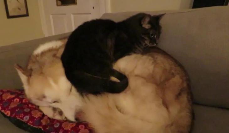 Uno de los vídeos más tiernos del momento: un gato empieza a "inspeccionar" lo blandito que está un perro y se tumba a dormir sobre él.