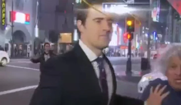 Un reportero de KTLA empuja a un viandante durante un directo en Hollywood