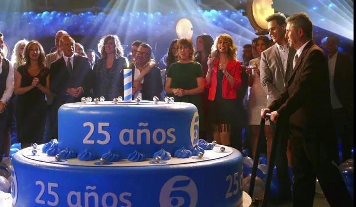 Los principales rostros de la cadena de Fuencarral se unen para celebrar los cinco lustros de vida del canal con una gran tarta.